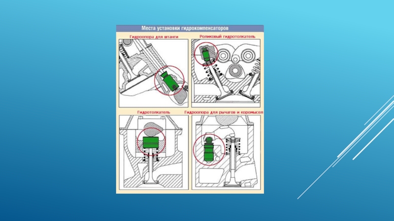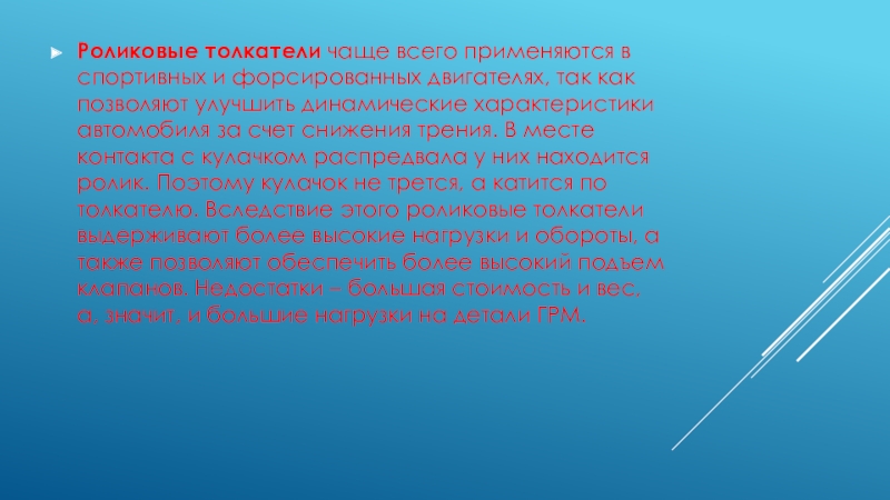 Слайд 18Роликовые толкатели чаще всего применяются в спортивных и форсированных двигателях, так