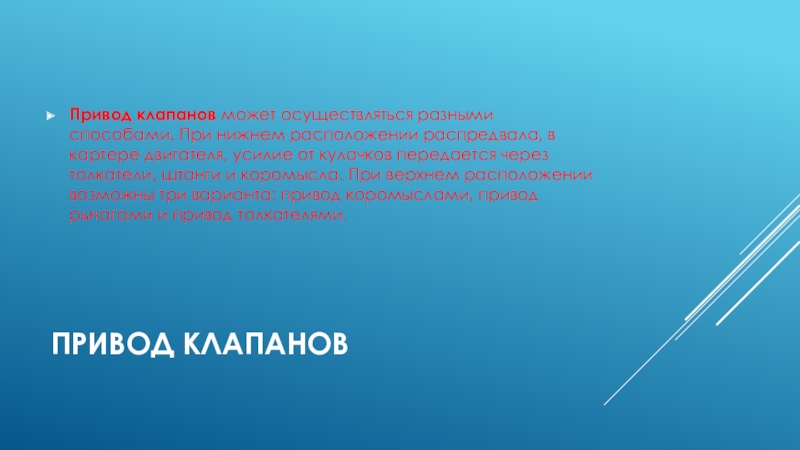 картере двигателя, усилие от кулачков передается через толкатели, штанги и коромысла. При верхнем расположении возможны три варианта: привод коромыслами, привод рычагами и привод толкателями.