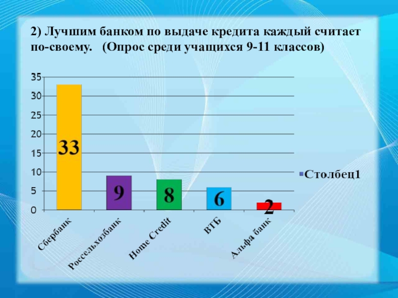 Слайд 212) Лучшим банком по выдаче кредита каждый считает по-своему. (Опрос