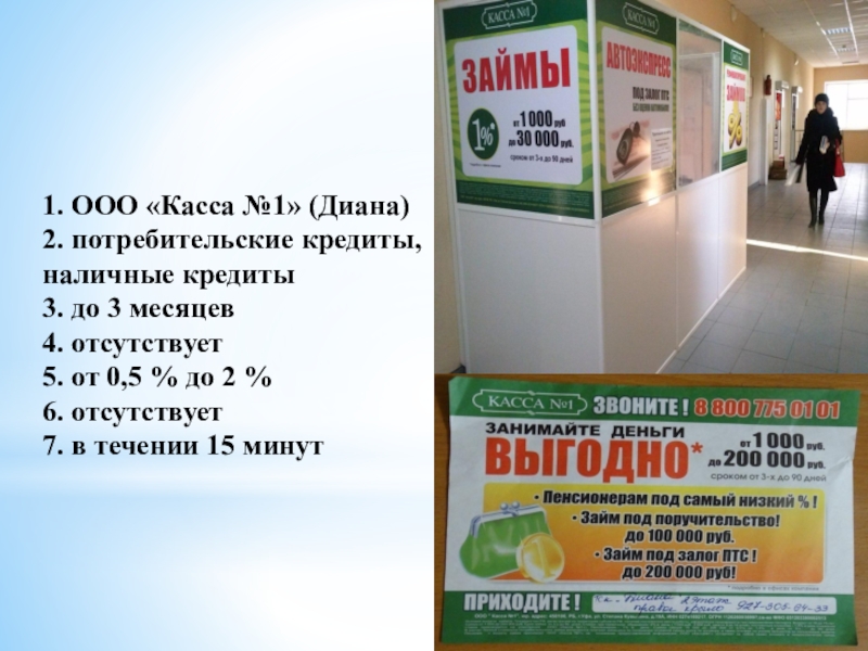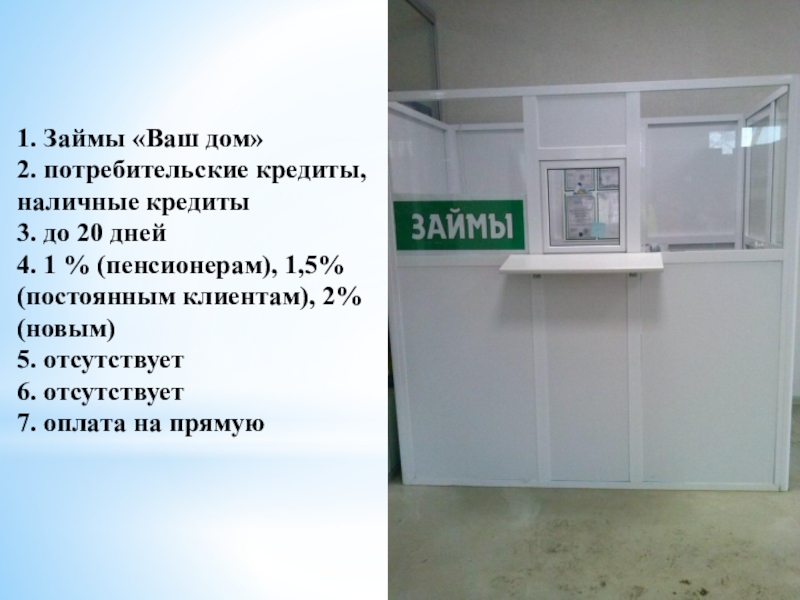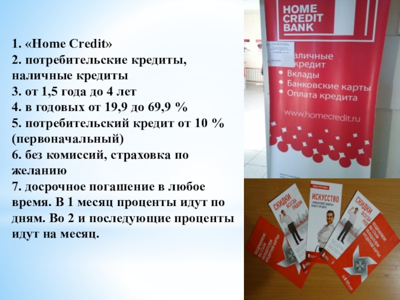 7. досрочное погашение в любое время. В 1 месяц проценты идут по дням. Во 2 и последующие проценты идут на месяц.