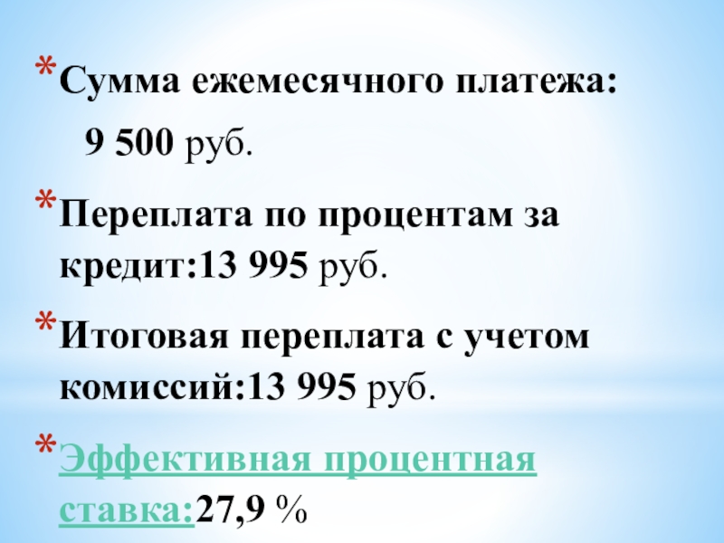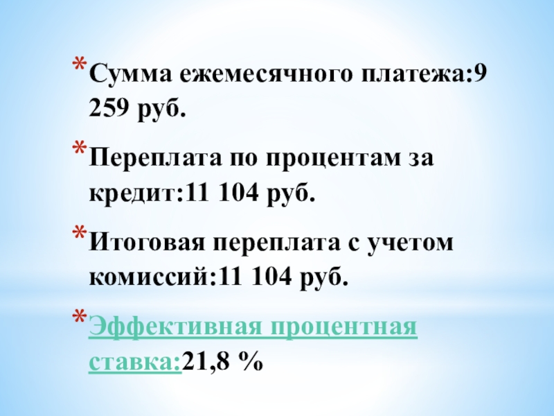 Слайд 36Сумма ежемесячного платежа:9 259 руб.