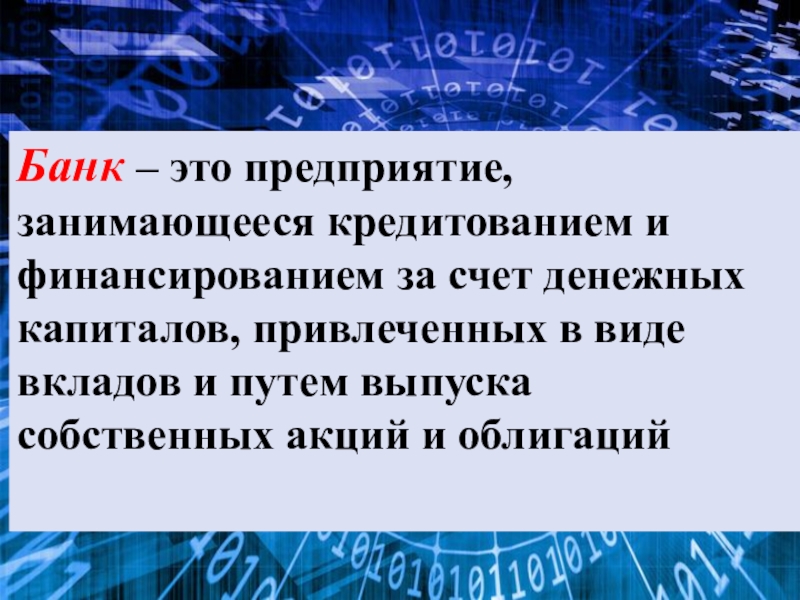 Слайд 6Банк – это предприятие, занимающееся кредитованием и финансированием за счет денежных
