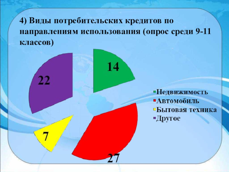 Слайд 254) Виды потребительских кредитов по направлениям использования (опрос среди 9-11 классов)