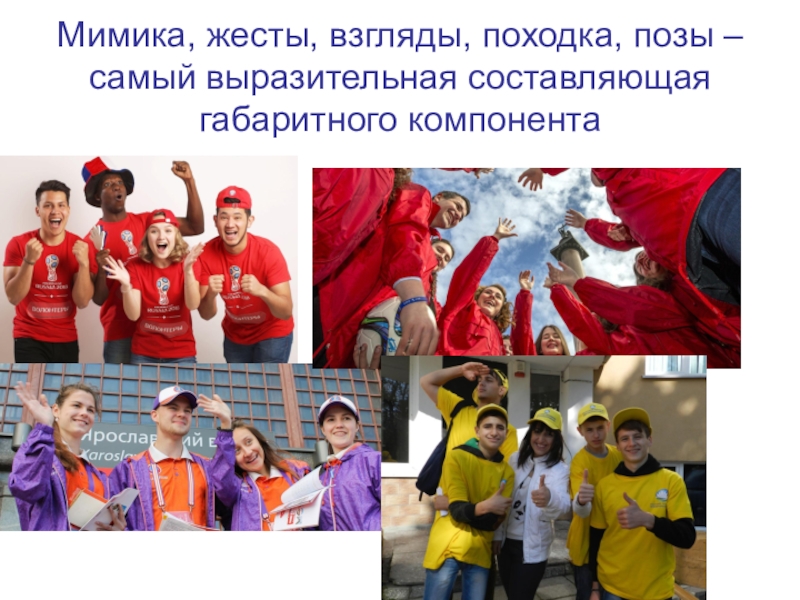 Слайд 13Мимика, жесты, взгляды, походка, позы – самый выразительная составляющая габаритного компонента
