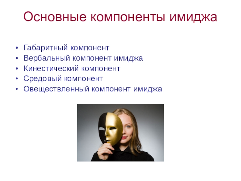 Основные компоненты имиджа Габаритный компонентВербальный компонент имиджаКинестический компонент Средовый компонент Овеществленный компонент имиджа
