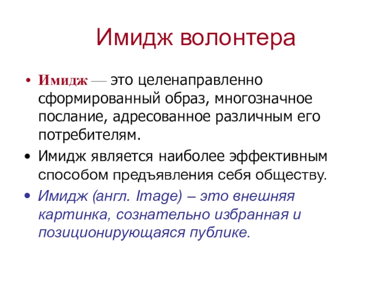Имидж волонтера Имидж — это целенаправленно сформированный образ, многозначное послание, адресованное различным его потребителям. Имидж является наиболее