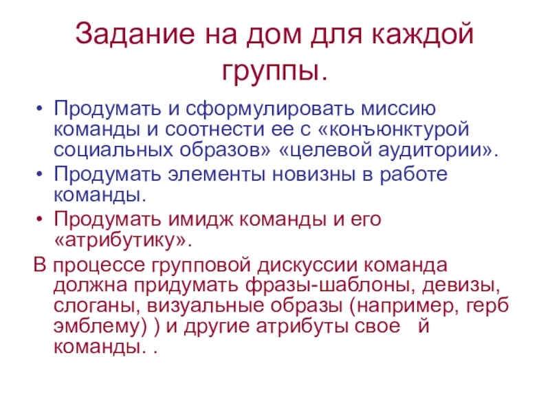 В процессе групповой дискуссии команда должна придумать фразы-шаблоны, девизы, слоганы, визуальные образы (например, герб эмблему) ) и другие атрибуты свое й команды. .