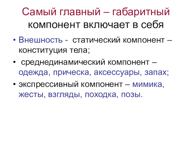 Самый главный – габаритный компонент включает в себя Внешность - статический компонент – конституция тела; среднединамический компонент