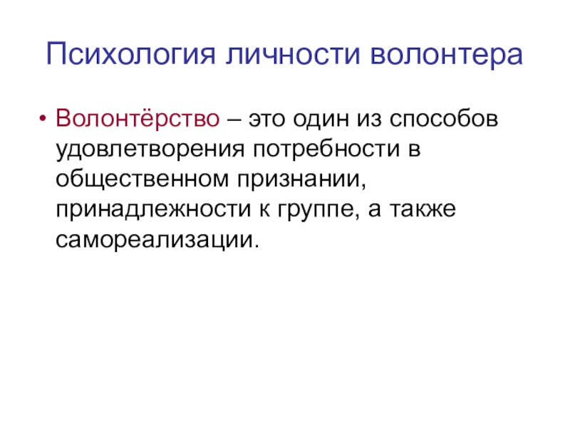 Психология личности волонтераВолонтёрство – это один из способов удовлетворения потребности в общественном признании, принадлежности к группе, а
