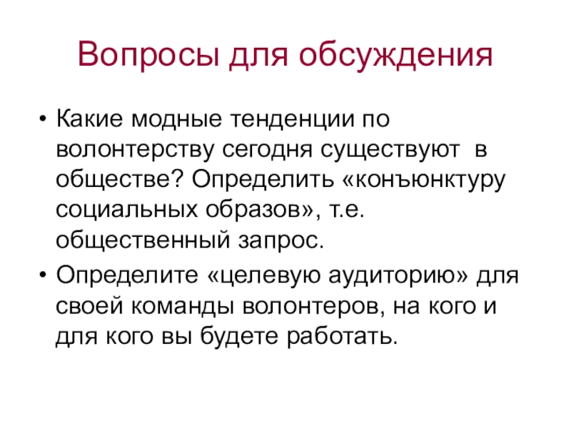 Вопросы для обсужденияКакие модные тенденции по волонтерству сегодня существуют в обществе? Определить «конъюнктуру социальных образов», т.е. общественный