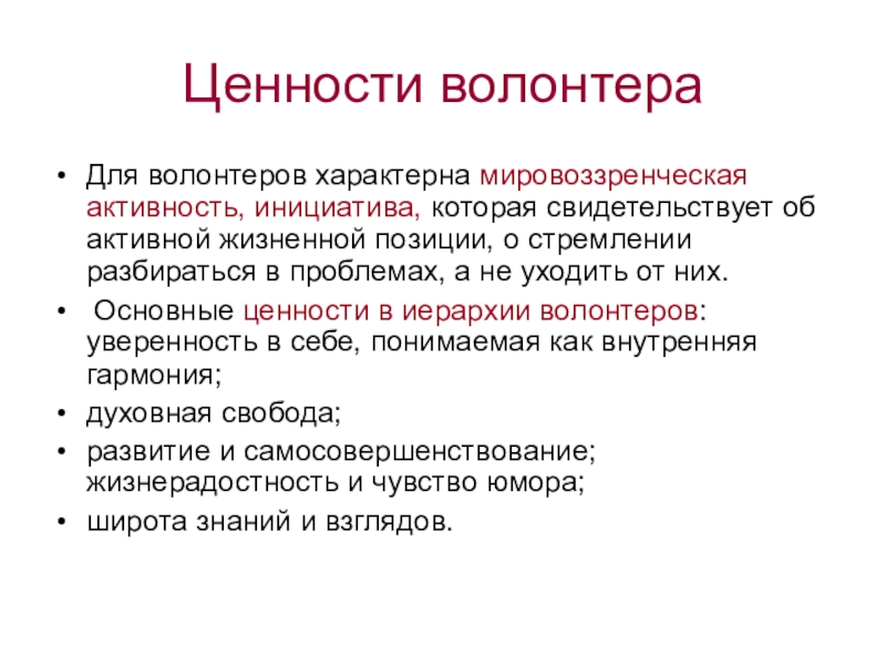 Ценности волонтера Для волонтеров характерна мировоззренческая активность, инициатива, которая свидетельствует об активной жизненной позиции, о стремлении разбираться