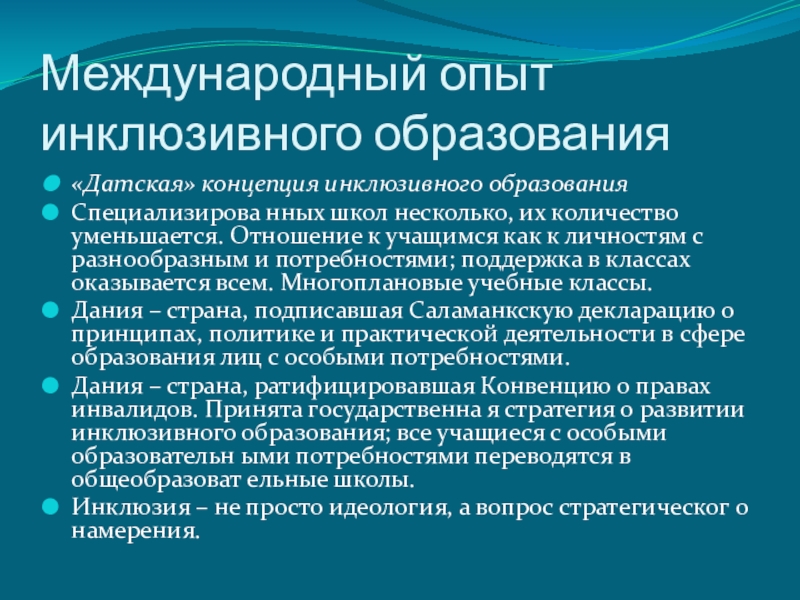 Дания – страна, ратифицировавшая Конвенцию о правах инвалидов. Принята государственна я стратегия о развитии инклюзивного образования; все учащиеся с особыми образовательн ыми потребностями переводятся в общеобразоват ельные школы.