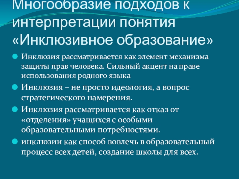 Слайд 3Многообразие подходов к интерпретации понятия «Инклюзивное образование»