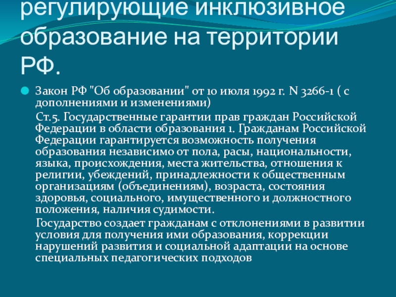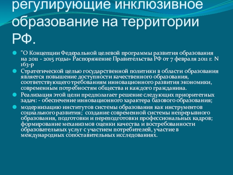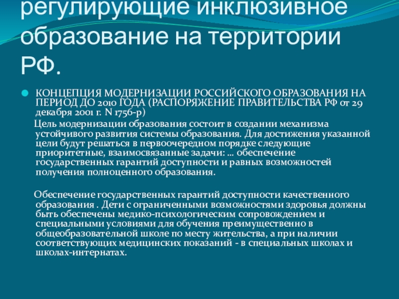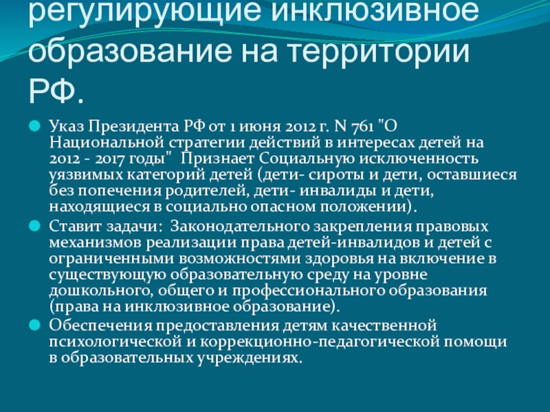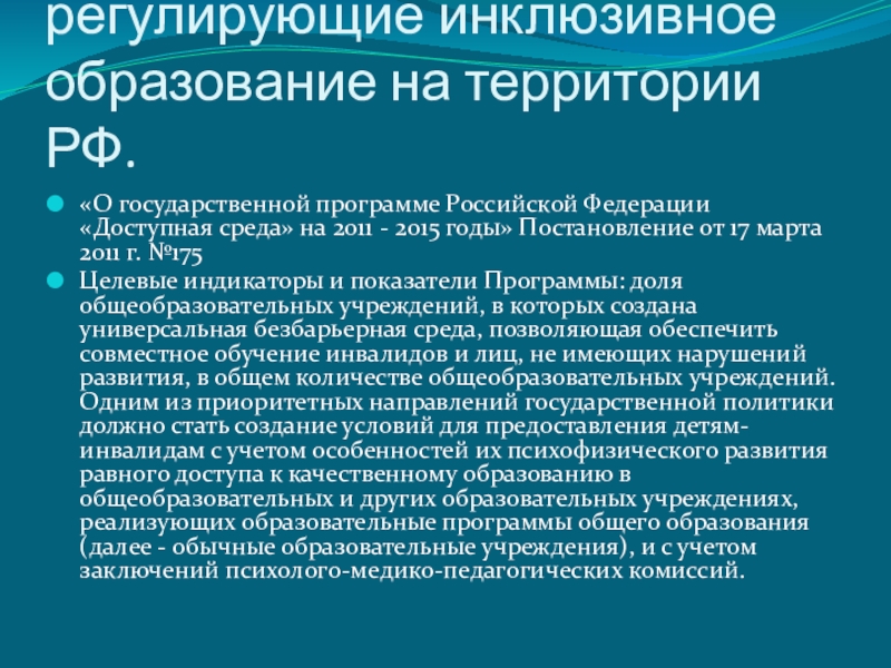 Слайд 6 Документы, регулирующие инклюзивное образование на территории РФ.