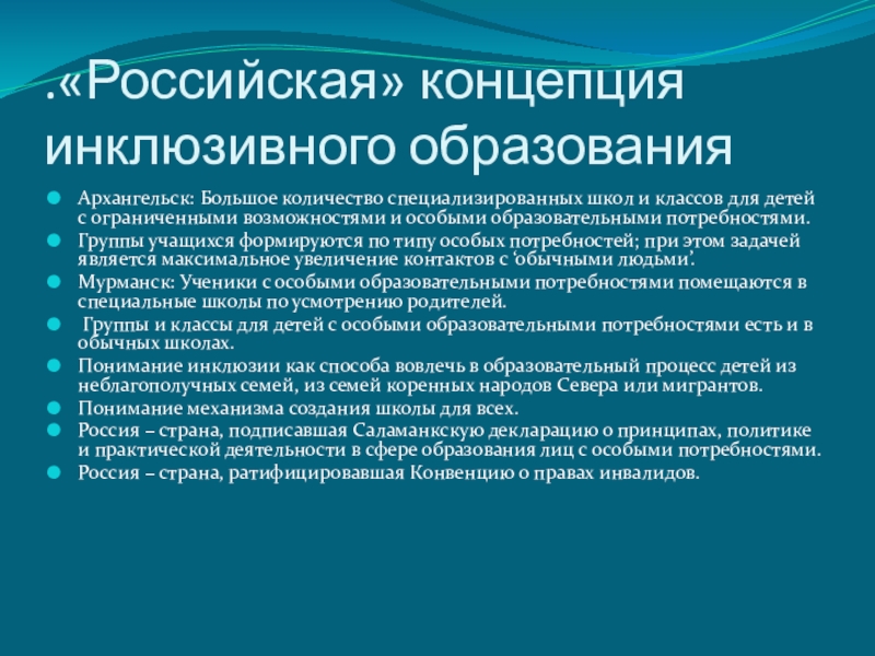 Россия – страна, подписавшая Саламанкскую декларацию о принципах, политике и практической деятельности в сфере образования лиц с особыми потребностями.