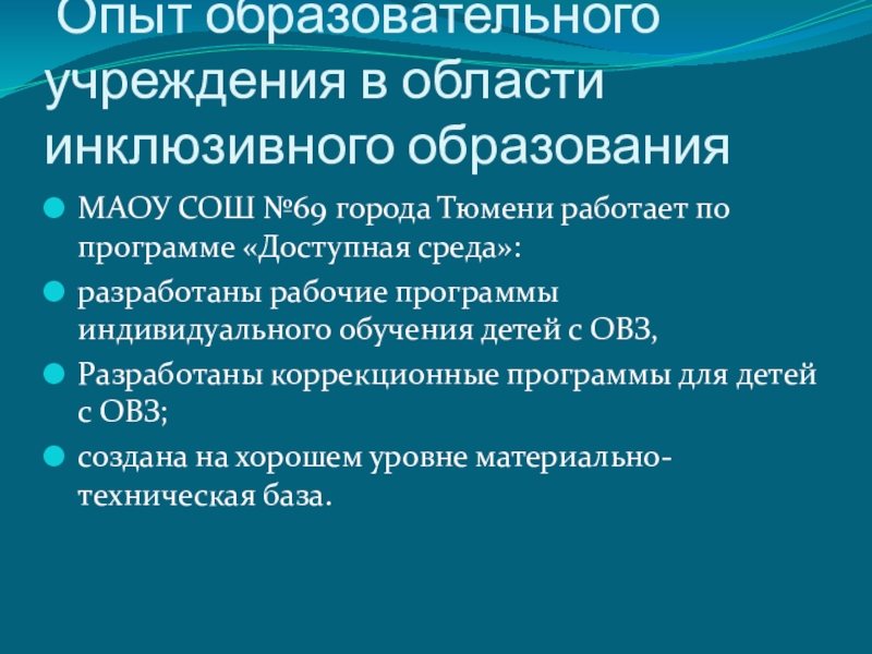 Слайд 18 Опыт образовательного учреждения в области инклюзивного образования