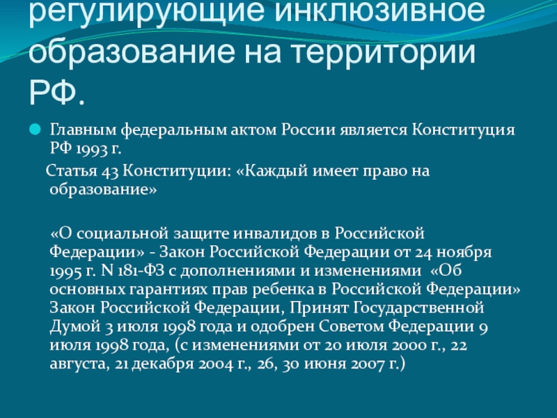 Слайд 7 Документы, регулирующие инклюзивное образование на территории РФ.