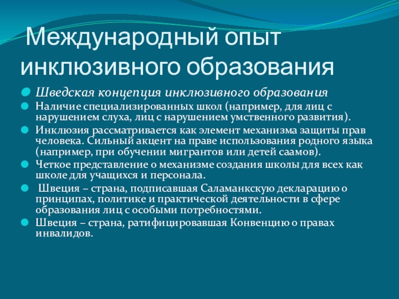 Швеция – страна, подписавшая Саламанкскую декларацию о принципах, политике и практической деятельности в сфере образования лиц с особыми потребностями.
