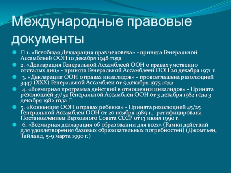 2. «Декларация Генеральной Ассамблеей ООН о правах умственно отсталых лиц» - принята Генеральной Ассамблеей ООН 20 декабря 1971 г.