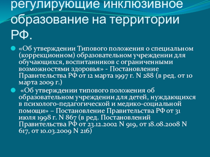«Об утверждении типового положения об образовательном учреждении для детей, нуждающихся в психолого-педагогической и медико-социальной помощи» – Постановление Правительства РФ от 31 июля 1998 г. N 867 (в ред. Постановлений Правительства РФ от 23.12.2002 N 919, от 18.08.2008 N 617, от 10.03.2009 N 216)