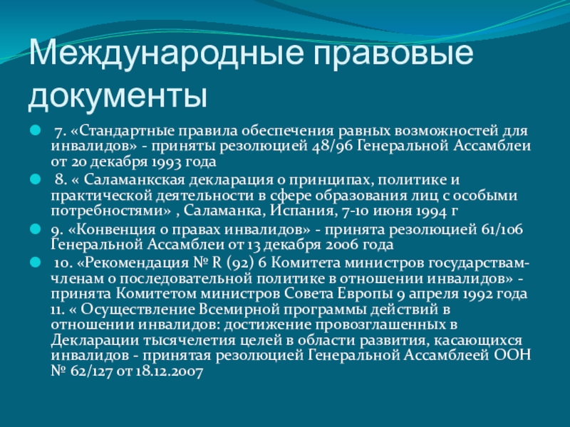 10. «Рекомендация № R (92) 6 Комитета министров государствам-членам о последовательной политике в отношении инвалидов» - принята Комитетом министров Совета Европы 9 апреля 1992 года 11. « Осуществление Всемирной программы действий в отношении инвалидов: достижение провозглашенных в Декларации тысячелетия целей в области развития, касающихся инвалидов - принятая резолюцией Генеральной Ассамблеей ООН № 62/127 от 18.12.2007