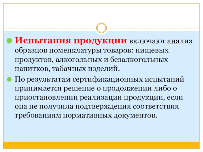 Слайд 18Испытания продукции включают анализ образцов номенклатуры товаров: пищевых продуктов, алкогольных и безалкогольных