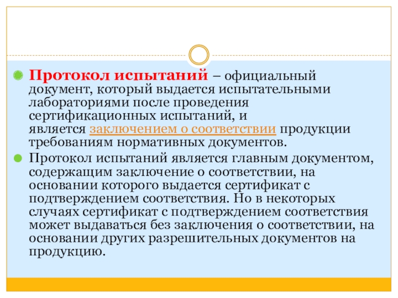 Слайд 15Протокол испытаний – официальный документ, который выдается испытательными лабораториями после проведения сертификационных