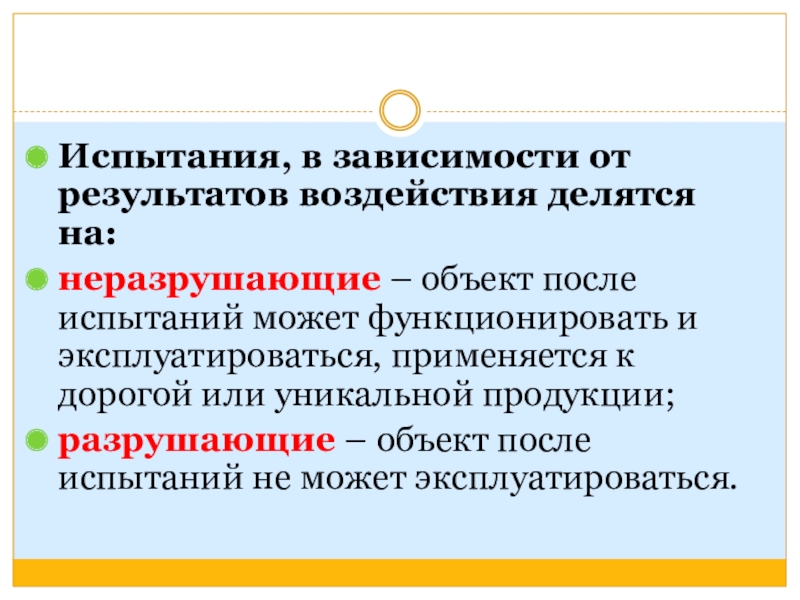 Слайд 13Испытания, в зависимости от результатов воздействия делятся на:
