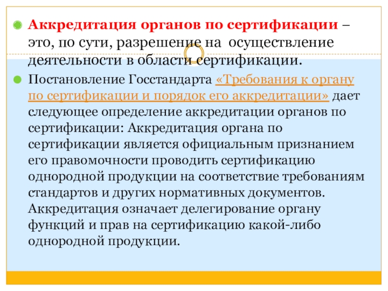 Постановление Госстандарта «Требования к органу по сертификации и порядок его аккредитации» дает следующее определение аккредитации органов по сертификации: Аккредитация органа по сертификации является официальным признанием его правомочности проводить сертификацию однородной продукции на соответствие требованиям стандартов и других нормативных документов. Аккредитация означает делегирование органу функций и прав на сертификацию какой-либо однородной продукции.