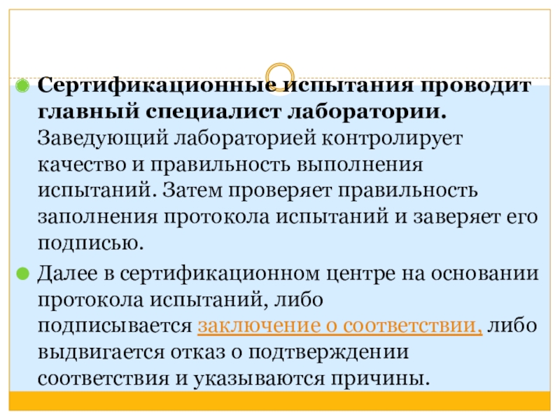 Слайд 14Сертификационные испытания проводит главный специалист лаборатории. Заведующий лабораторией контролирует качество и
