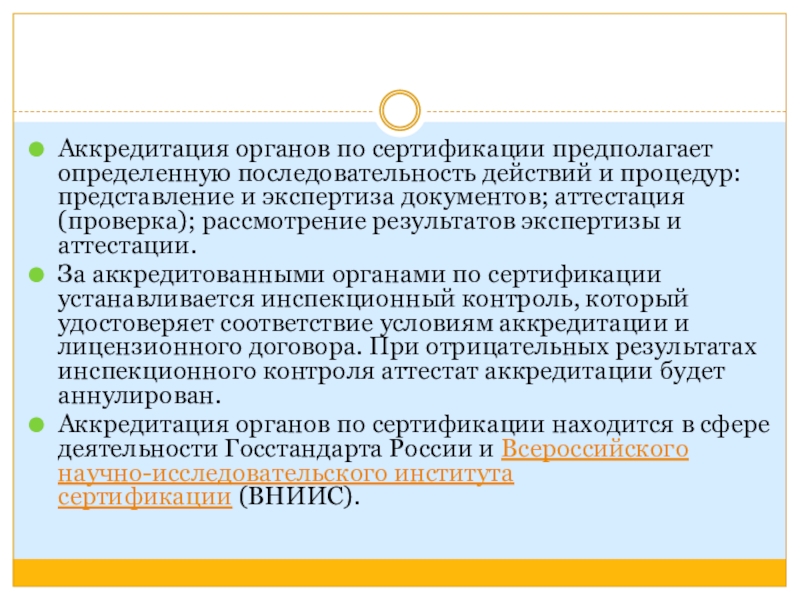 Аккредитация органов по сертификации находится в сфере деятельности Госстандарта России и Всероссийского научно-исследовательского института сертификации (ВНИИС).