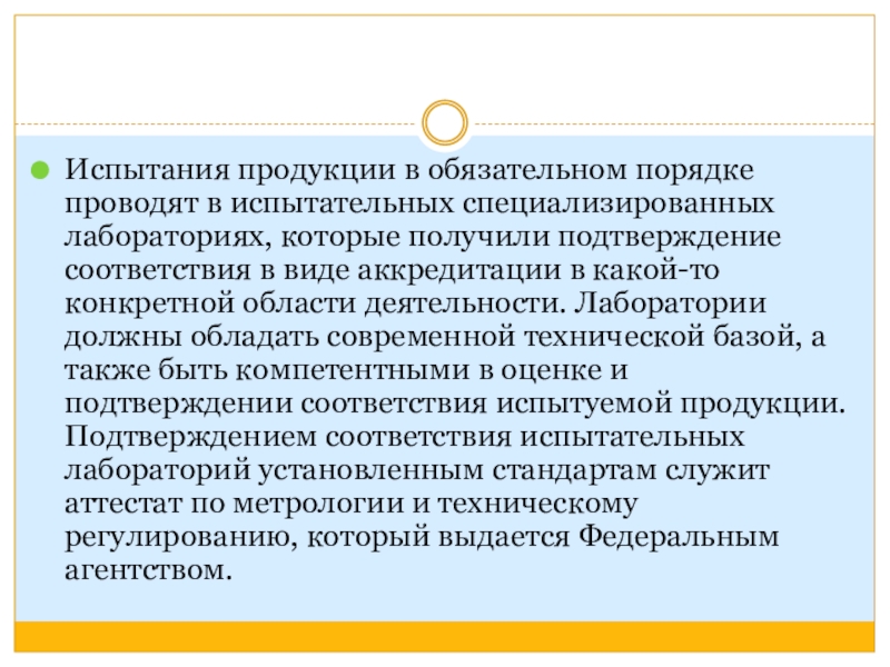получили подтверждение соответствия в виде аккредитации в какой-то конкретной области деятельности. Лаборатории должны обладать современной технической базой, а также быть компетентными в оценке и подтверждении соответствия испытуемой продукции. Подтверждением соответствия испытательных лабораторий установленным стандартам служит аттестат по метрологии и техническому регулированию, который выдается Федеральным агентством.