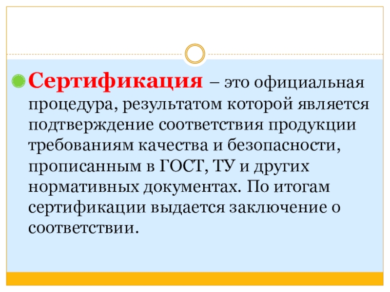 Слайд 9Сертификация – это официальная процедура, результатом которой является подтверждение соответствия продукции требованиям