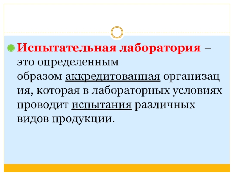 Слайд 2Испытательная лаборатория – это определенным образом аккредитованная организация, которая в лабораторных условиях проводит испытания различных