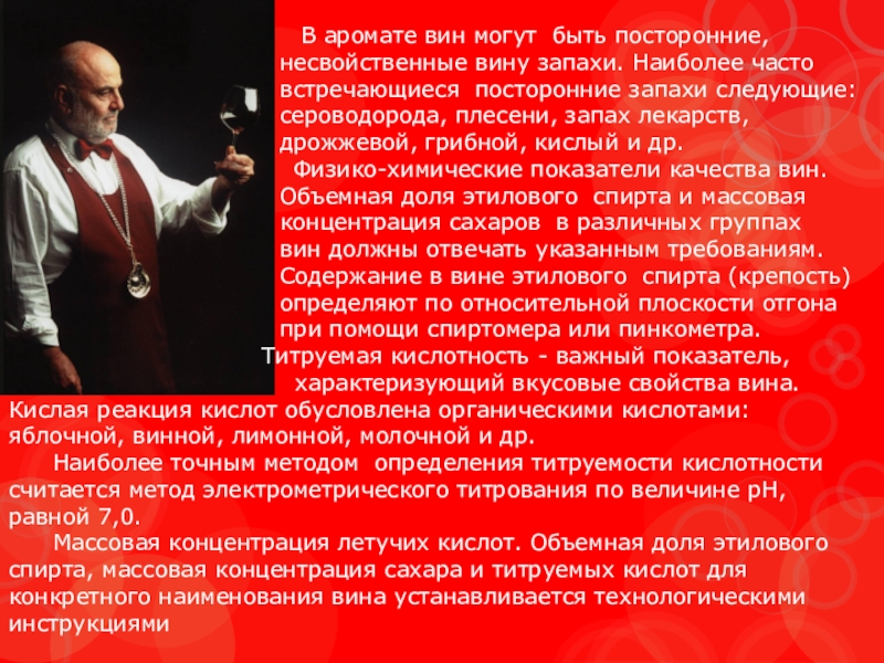 Массовая концентрация летучих кислот. Объемная доля этилового спирта, массовая концентрация сахара и титруемых кислот для конкретного наименования вина устанавливается технологическими инструкциями