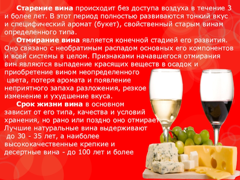 Слайд 6 Старение вина происходит без доступа воздуха в течение 3 и более
