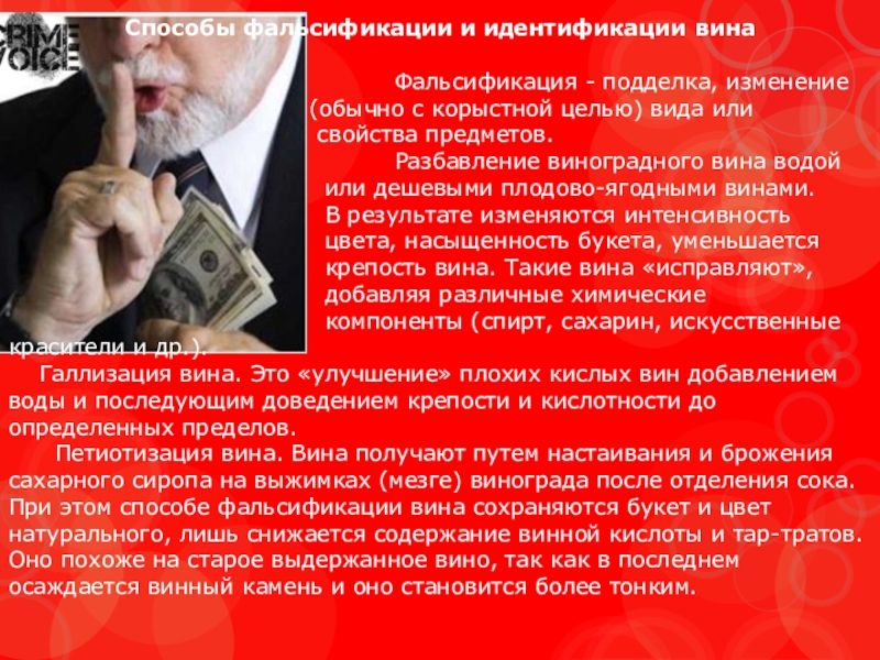 Петиотизация вина. Вина получают путем настаивания и брожения сахарного сиропа на выжимках (мезге) винограда после отделения сока. При этом способе фальсификации вина сохраняются букет и цвет натурального, лишь снижается содержание винной кислоты и тар-тратов. Оно похоже на старое выдержанное вино, так как в последнем осаждается винный камень и оно становится более тонким.