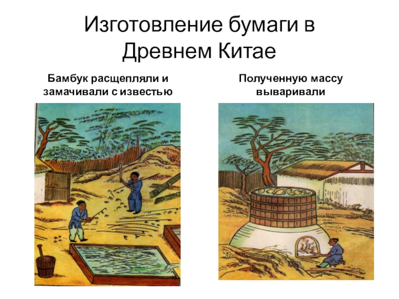 Изготовление бумаги в Древнем КитаеБамбук расщепляли и замачивали с известьюПолученную массу вываривали