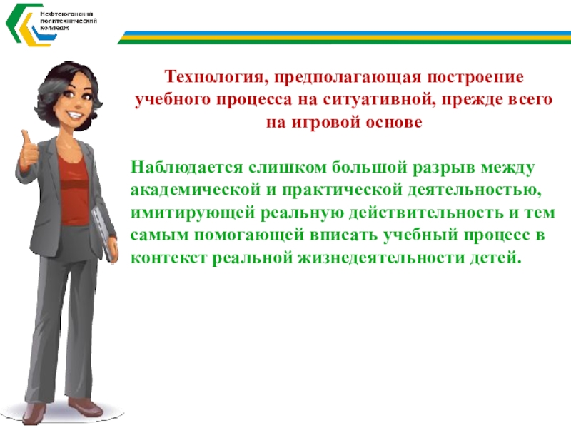 Слайд 13Технология, предполагающая построение учебного процесса на ситуативной, прежде всего на игровой