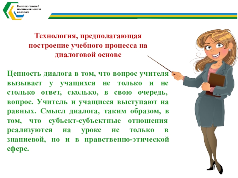 что вопрос учителя вызывает у учащихся не только и не столько ответ, сколько, в свою очередь, вопрос. Учитель и учащиеся выступают на равных. Смысл диалога, таким образом, в том, что субъект-субъектные отношения реализуются на уроке не только в знаниевой, но и в нравственно-этической сфере.