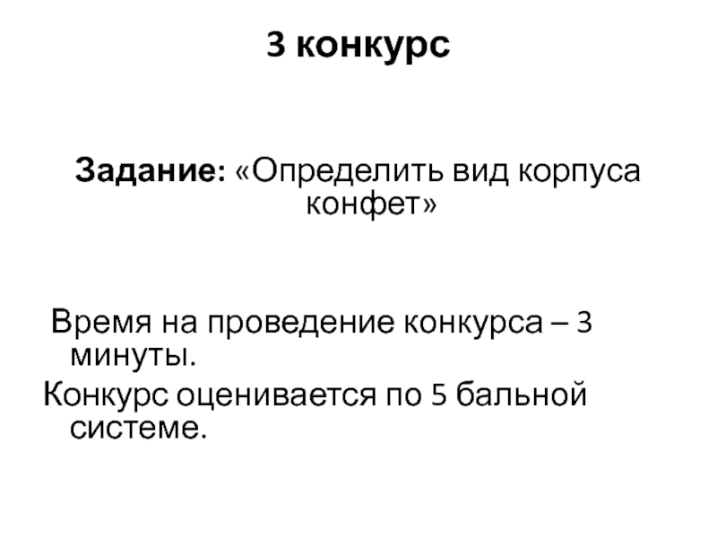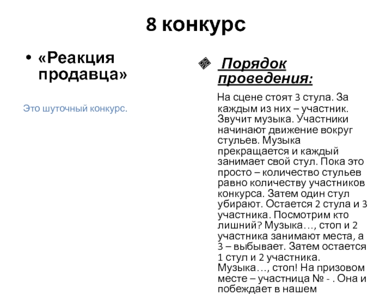 3 стула. За каждым из них – участник. Звучит музыка. Участники начинают движение вокруг стульев. Музыка прекращается и каждый занимает свой стул. Пока это просто – количество стульев равно количеству участников конкурса. Затем один стул убирают. Остается 2 стула и 3 участника. Посмотрим кто лишний? Музыка…, стоп и 2 участника занимают места, а 3 – выбывает. Затем остается 1 стул и 2 участника. Музыка…, стоп! На призовом месте – участница № - . Она и побеждает в нашем шуточном конкурсе, зарабатывая 5 баллов!