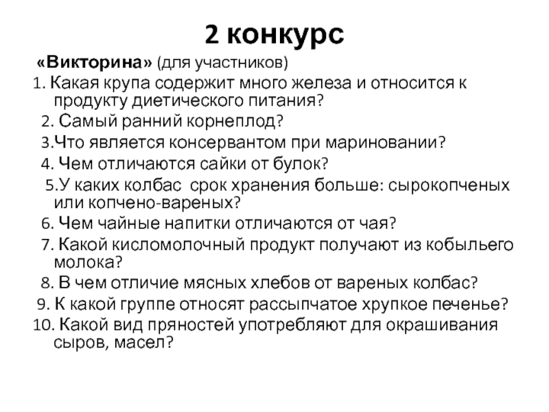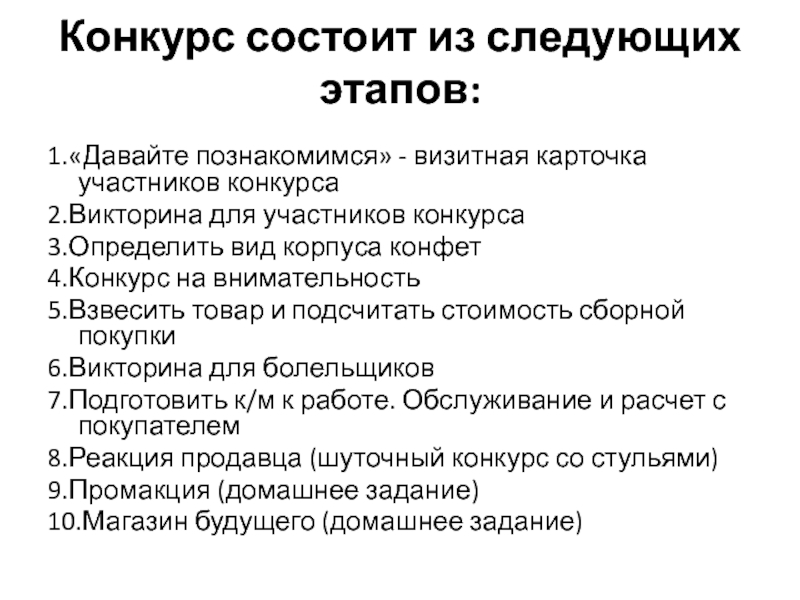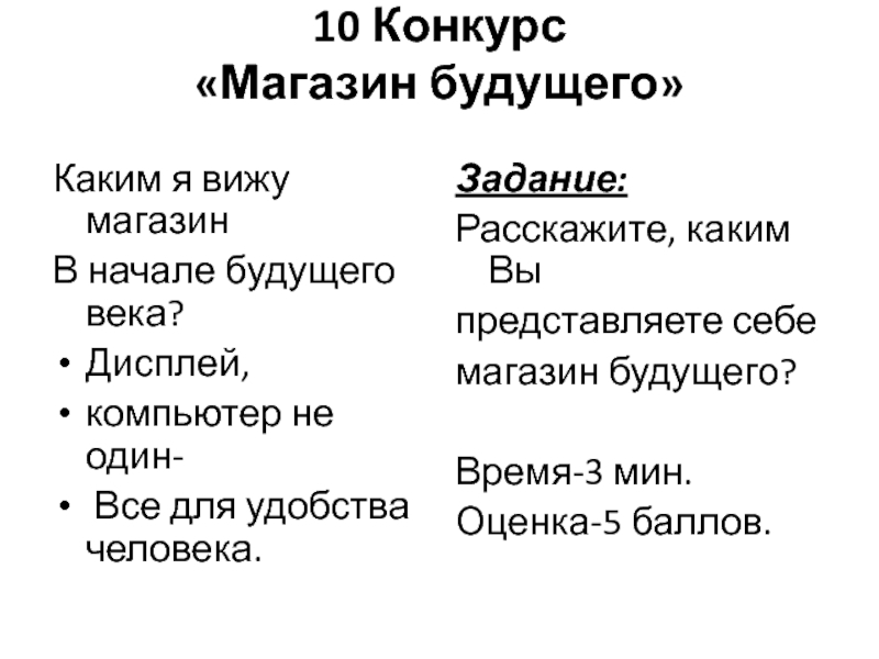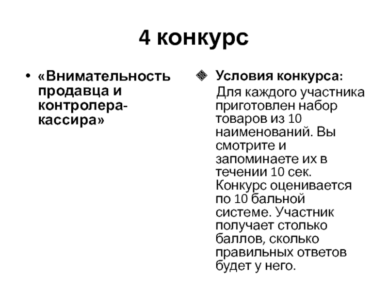 приготовлен набор товаров из 10 наименований. Вы смотрите и запоминаете их в течении 10 сек. Конкурс оценивается по 10 бальной системе. Участник получает столько баллов, сколько правильных ответов будет у него.