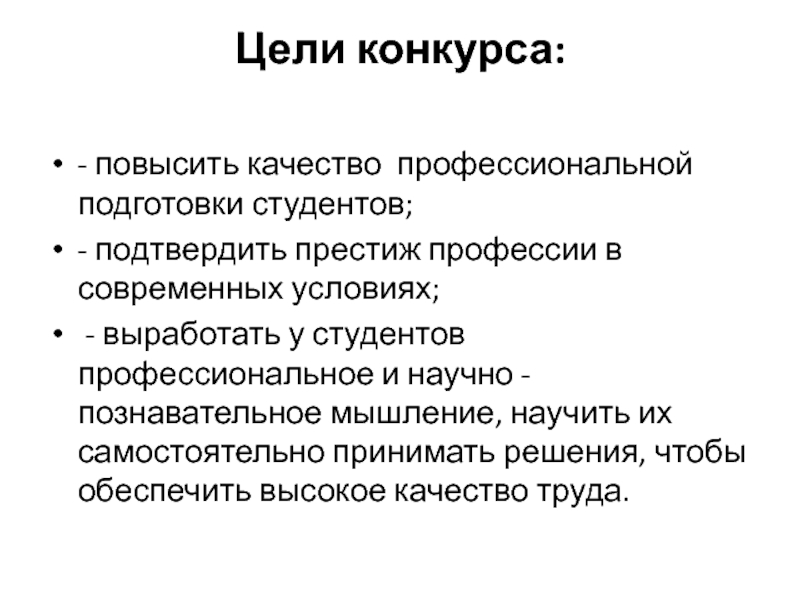 - выработать у студентов профессиональное и научно - познавательное мышление, научить их самостоятельно принимать решения, чтобы обеспечить высокое качество труда.