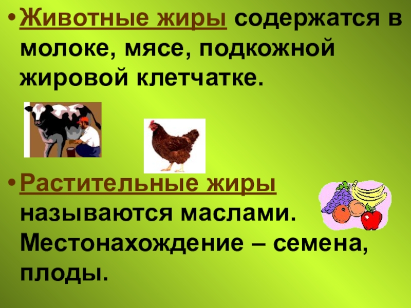 У животных такие клетки находятся под кожей, в грудных железах и сальнике. Жир содержится в молоке всех млекопитающих.