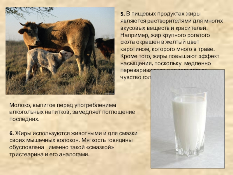 6. Жиры используются животными и для смазки своих мышечных волокон. Мягкость говядины обусловлена именно такой «смазкой» тристеарина и его аналогами.