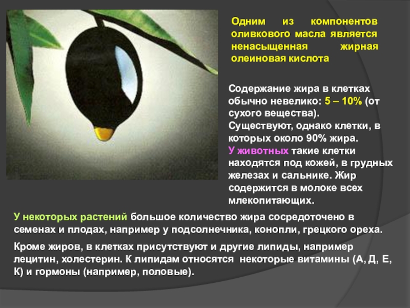 Содержание жира в клетках обычно невелико: 5 – 10% (от сухого вещества).