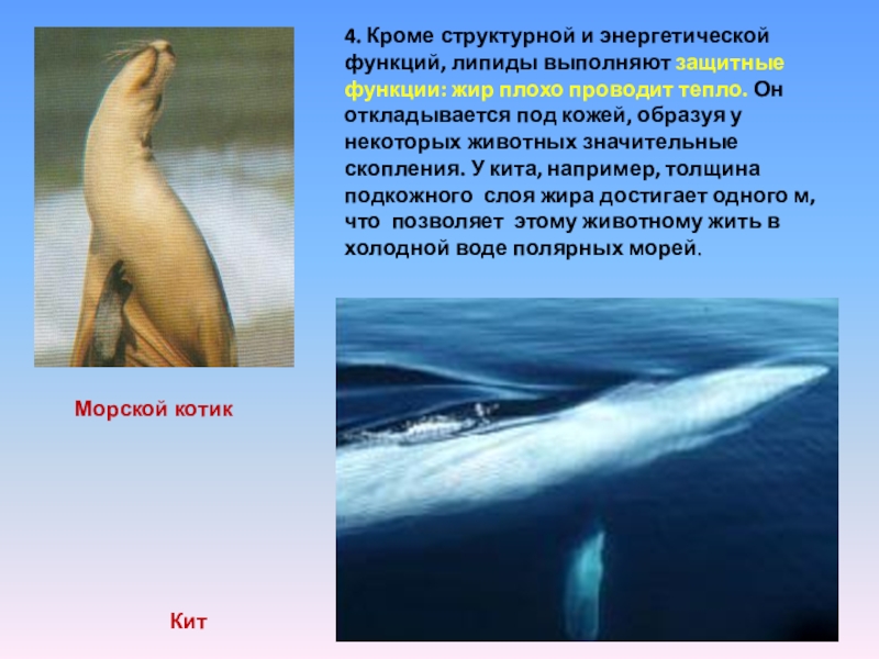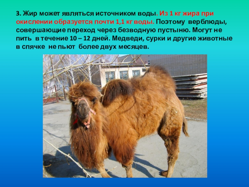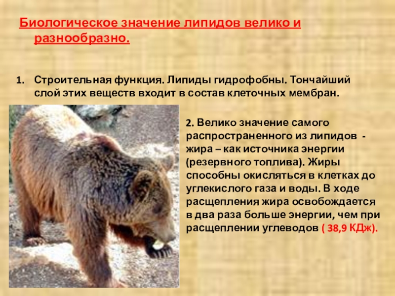 2. Велико значение самого распространенного из липидов - жира – как источника энергии (резервного топлива). Жиры способны окисляться в клетках до углекислого газа и воды. В ходе расщепления жира освобождается в два раза больше энергии, чем при расщеплении углеводов ( 38,9 КДж).