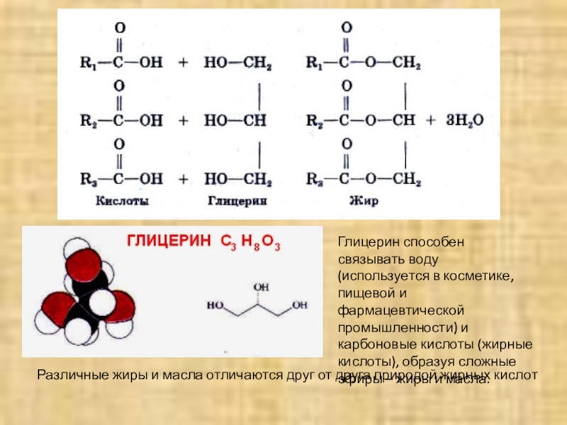 Глицерин способен связывать воду (используется в косметике, пищевой и фармацевтической промышленности) и карбоновые кислоты (жирные кислоты), образуя сложные эфиры – жиры и масла.