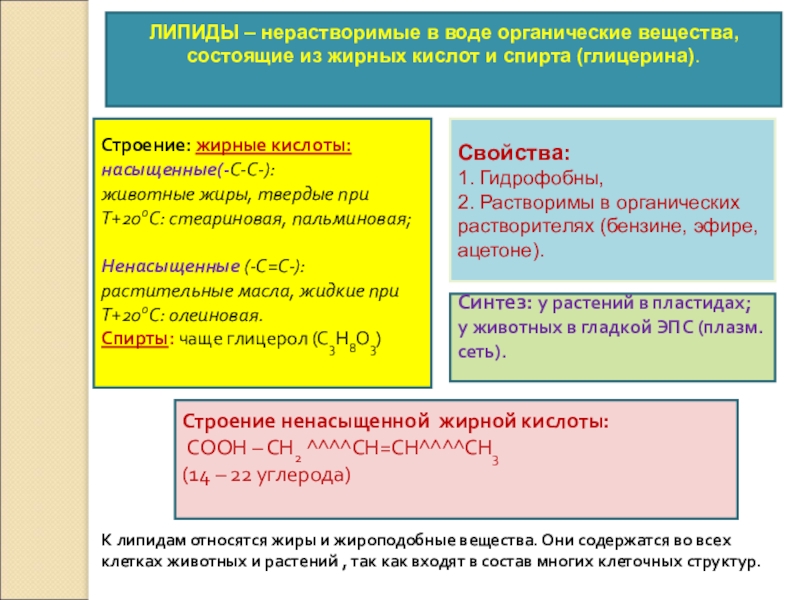 К липидам относятся жиры и жироподобные вещества. Они содержатся во всех клетках животных и растений , так как входят в состав многих клеточных структур.