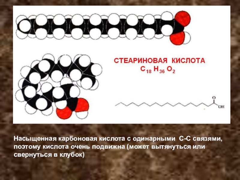 Строение: жирные кислоты: насыщенные(-С-С-): животные жиры, твердые при Т+200С: стеариновая, пальминовая;